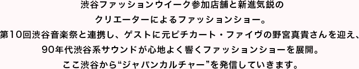 渋谷ファッションウイーク参加店舗と新進気鋭のクリエーターによるファッションショー。第10回渋谷音楽祭と連携し、ゲストに元ピチカート・ファイブの野宮真貴さんを迎え、90年代渋谷系サウンドが心地よく響くファッションショーを展開。ここ渋谷から“ジャパンカルチャー”を発信していきます。